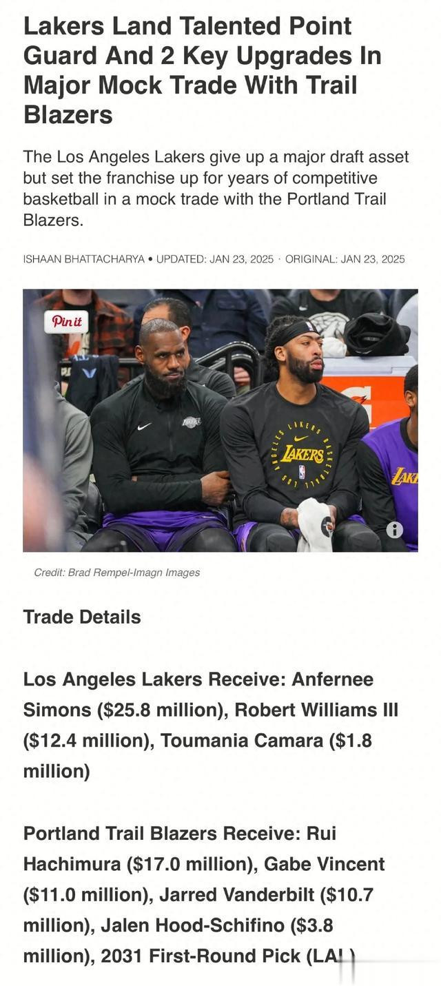 据美媒《FW》作者Ishaan Bhattacharya给出湖人与开拓者交易获得安芬尼·西蒙斯、罗威的模拟方案如下: